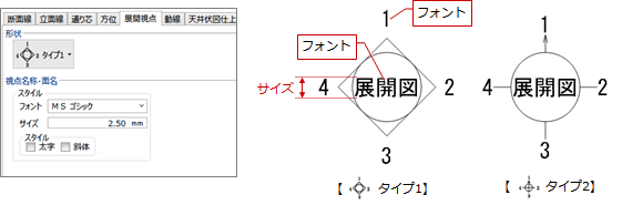 展開図の視点位置を示す形状、視点名称のフォントなどを設定します。