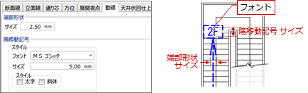 動線の端部形状や階移動記号のサイズ、フォントなどを設定します。また、動線の線色・線幅・線種などを設定します。