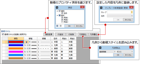 - 動線スタイルに設定した「名称」「用途1」などの項目を動線のプロパティで入力することで、各動線の線色・線幅・線種が有効になります。