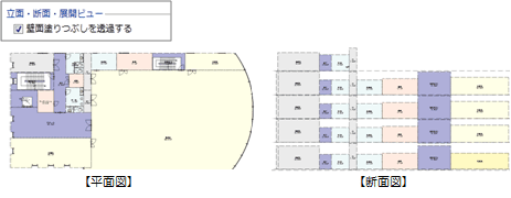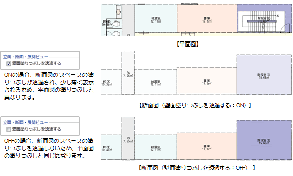 「壁面塗りつぶしを透過する」がONの場合、平面ビューと立面・断面・展開ビューではスペース・用途区画の塗りつぶし色が異なり、立面・断面・展開ビューの方が少し薄く表示されます。