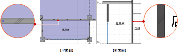 - 「ハッチング有無」の「平面」「断面」がONの場合に、各ビューでハッチングが表示されます。