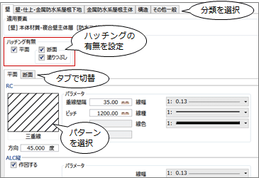 ハッチングは適用要素ごと(壁、屋根などの分類)に設定します。例えば、壁のハッチングは「壁」タブ、柱を変更する場合は「構造」タブで変更します。