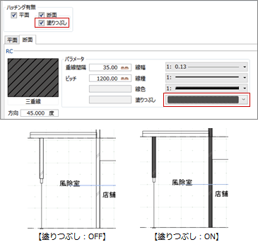 また、断面ビューにおいて、切断面を塗りつぶし表示にしたい場合は、「塗りつぶし」をONにして各材質の「塗りつぶし」で色を設定します。