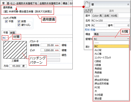 壁の主体層、下地層、構造躯体などの分類別に、材質ごとのハッチングを設定します。