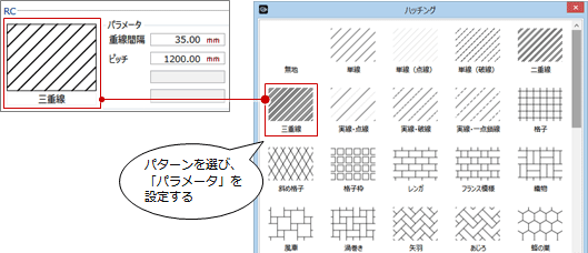 (分類とパターンについては、「ハッチングの適用要素とパターン」を参照) - 「パラメータ」を設定します。