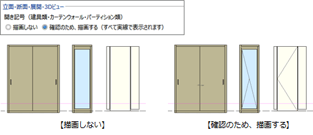 3D・立面・断面・展開ビューで、建具・カタログ建具・カーテンウォール・ハイパーティション・ローパーティション・トイレパーティション・移動パーティションの開き記号を表示するかどうかを設定します。
