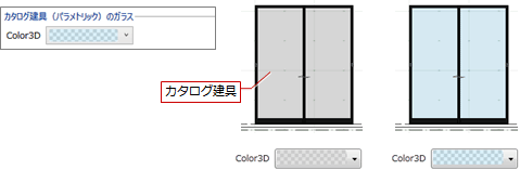 3D・立面・断面・展開ビューで表示するカタログ建具(立体データがパラメトリック)のガラス色を変更します。