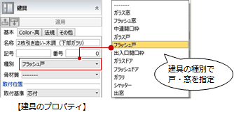 - 掃き出しの表現は、建具・カタログ建具のプロパティの「種別」を参照します。