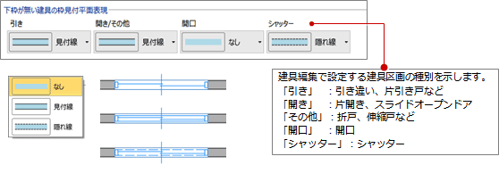 下枠が無い建具の枠見付の平面表現を、引き、開きなどの建具種別ごとに選択します。