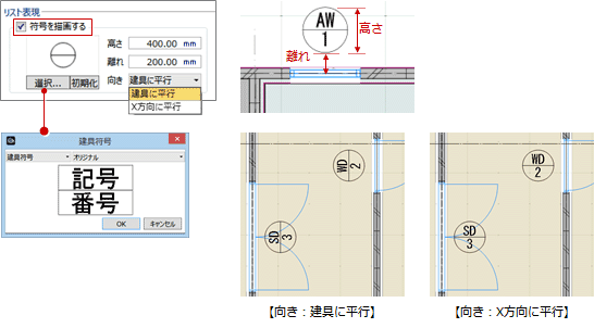 建具リストの符号を表示するには、「符号を描画する」をONにして、符号のサイズ、離れ、向きを設定します。