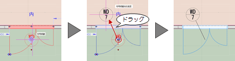 - 建具を選択したときのハンドルが「◇符号移動」の状態でドラッグすると、建具符号を任意の位置に移動できます。また、建具符号を選択したときに足先に表示されるハンドルをドラッグすると、足先の位置も変更できます。