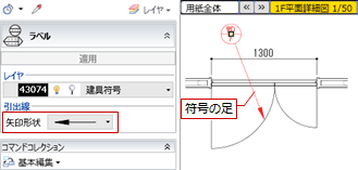 - 図面・GLOOBEシートの平面詳細図、建具キープラン、LVS平面図で足つきの建具符号を選択すると、符号の足の矢印形状を変更することができます。モデルでは符号の足の矢印形状を変更できません。