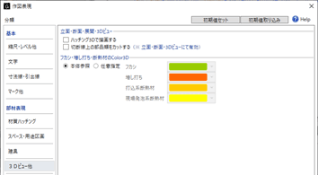 3Dビューなどにおけるハッチング3D、部品類、フカシ・増し打ちの描画について設定します。