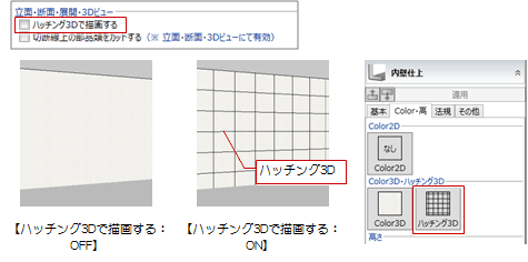 立面・断面・展開・3Dビューで、仕上などのプロパティで設定しているハッチング3Dを描画するかどうかを設定します。