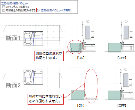 立面・断面・3Dビューにて部品類を切断線上の形状で描画するにはM037230_vie_sec02