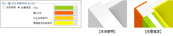配置状況確認のため、3Dビューでフカシ、増し打ち、断熱材の色を変更するときは、「任意指定」をONにして色を設定します。