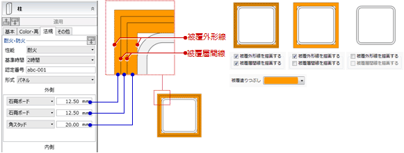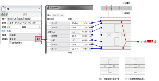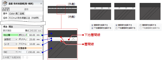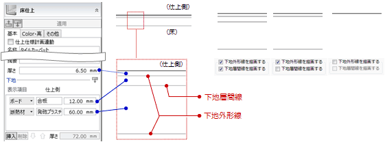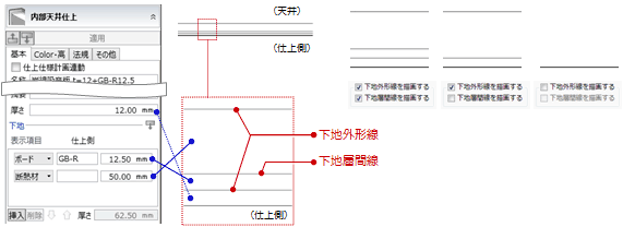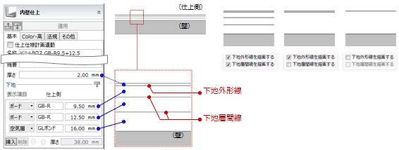 被覆層間線、下地層間線を描画したいときは、それぞれの項目にチェックを付けます。