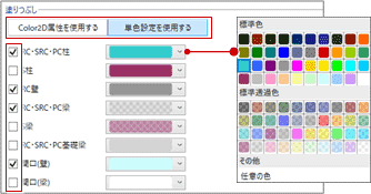 「Color2D属性を使用する」または「単色設定を使用する」を選んで、塗りつぶす部材にチェックを付けます。