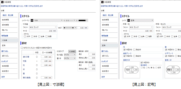 杭伏図、底盤伏図、基礎伏図、見上図、見下図、屋上伏図、断面図、軸組図における寸法線と記号について設定します。