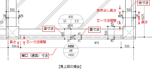 「一般図寸法線」で入力した寸法線も作図する場合は「モデルで入力した一般図寸法線を作図する」をONにします。 - 寸法線の作図位置はプログラム固定です。芯振分け寸法で描画します。