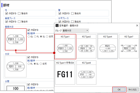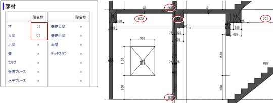 - 躯体断面図では常に記号が作図されます。記号の前に階の番号を付けたい場合は、その部材の「階名称」をクリックして「○」にします。