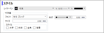 「スタイル」で、加筆する寸法線のレイヤ、線幅、線種、線色、フォント、矢印形状などを設定します。