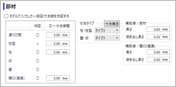 「部材」で、寸法線を加筆する部材の「作図」を「○」にします。クリックするごとに「○」と「×」が切り替わります。