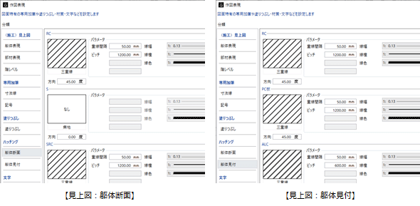 底盤伏図、基礎伏図、見上図、見下図における躯体のハッチングについて設定します。