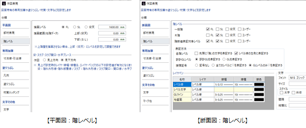 平面系図面における部材の描画レベルや、断面系図面における階のレベル表示を設定します。