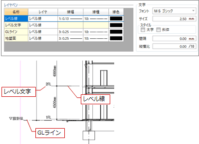 「レイヤペン」で、レベル線・レベル文字・GLラインを格納するレイヤと線幅、線種、線色を設定します。
