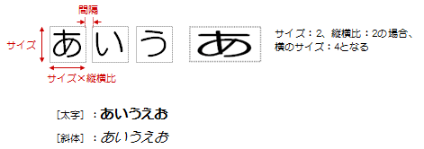 - 文字のサイズ、スタイル、間隔、縦横比は、次のようになっています。