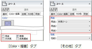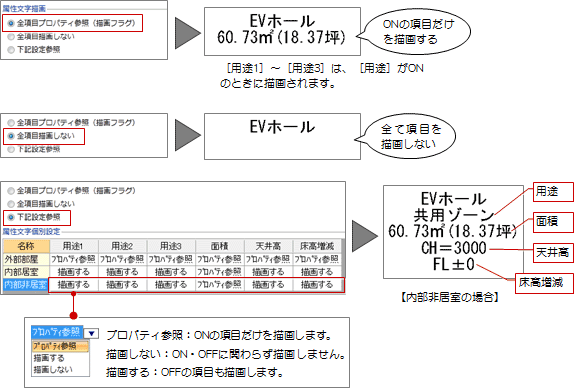 スペースのプロパティの「用途」「面積」「天井高」「床高増減」を描画するかどうかを設定します。