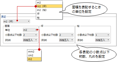用途区画の面積を表記するときの単位やまるめを設定します。