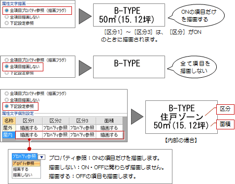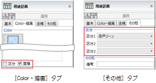 用途区画のプロパティの「区分」「面積」を描画するかどうかを設定します。