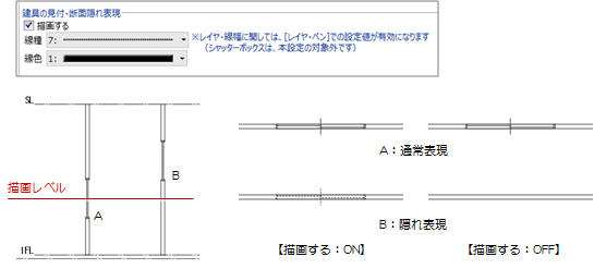 描画レベルより上に存在する建具を描画するときは、「描画する」をONにして、線種と線色を設定します。