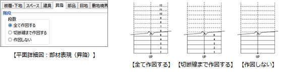 配置図、平面図、天井伏図、平面詳細図、矩計図のときに「昇降」タブで設定できます。