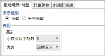 高低差が3mを超えるため地盤面を分割している場合に、ボリューム解析配置図で地盤面と平均地盤面のどちらを表示するかを設定します。また、高さ表記の小数点以下桁数と丸めを設定します。