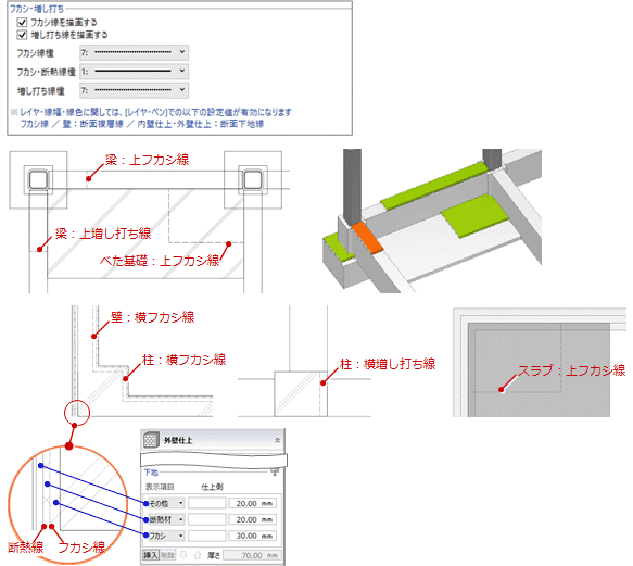 仕上の下地層にフカシや断熱材を設定した場合は、「レイヤ・ペン」の「内外装-外壁仕上・内壁仕上:断面下地線」のレイヤ・線幅・線色を使用します。 - 平面詳細図では、梁、連続基礎、独立基礎、柱型の横フカシ・横増し打ち線、および独立基礎の上フカシ線は作図しません。