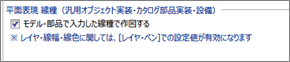 - 「モデル・部品で入力した線種で作図する」がONの場合も、汎用オブジェクト(実装)、カタログ部品(実装)、設備のレイヤ、線幅、線種は「レイヤ・ペン」の設定が有効です。