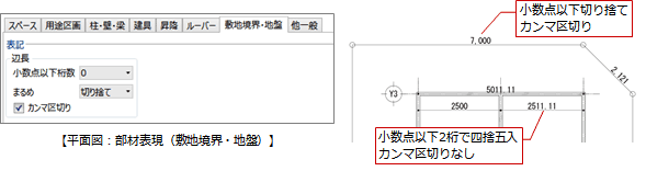 敷地面積求積図、配置図、全体投影配置図、平面図、天井伏図、平面詳細図、建具キープラン、LVS平面図、確認申請配置図、確認申請平面図のときに、敷地辺の長さの小数点以下桁数、まるめ、カンマ区切りの有無を設定します。