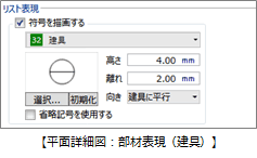 配置図、平面図、天井伏図、建具キープラン、LVS平面図、確認申請平面図の場合は、簡略表現にするか、標準表現にするかを選択します。