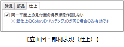 断面図、立面図、矩計図、展開図、確認申請立面図、確認申請断面図、燃焼断面図のときに「仕上」タブで設定できます。
