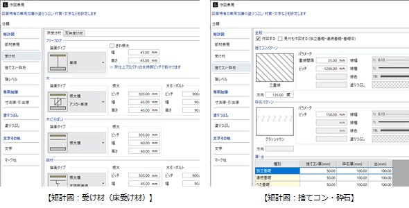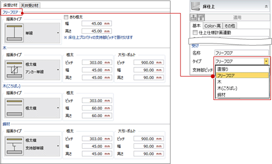 床仕上の「受け」で設定するタイプごとに、描画タイプや寸法を設定します。
