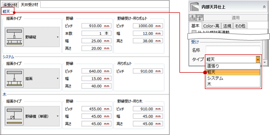 天井仕上の「受け」で設定するタイプごとに、描画タイプや寸法を設定します。
