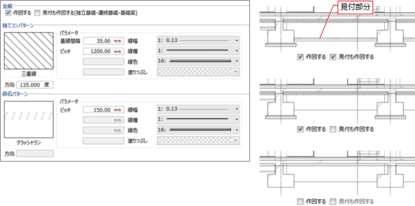 独立基礎・連続基礎・基礎梁に対して、断面部分のみに捨てコン・砕石を描画するときは、「見付も作図する」をOFFにします。「見付も作図する」がONのときは、断面部分と見付部分に描画します。