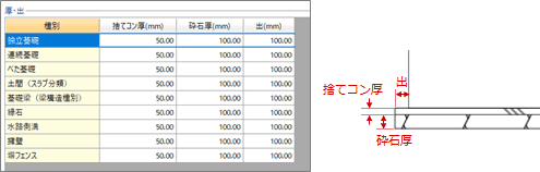 オブジェクトごとに捨てコン厚、砕石厚、出を設定します。