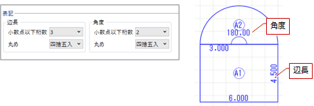 面積区画の辺長、角度について、小数点以下桁数と丸めを設定します。各面積求積図で別々に設定できます。