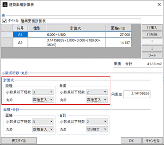 - 建築面積計算表、床面積計算表、領域面積計算表、LVS面積計算表を作成するときに、「計算式」の小数点以下桁数と丸めに連動します。