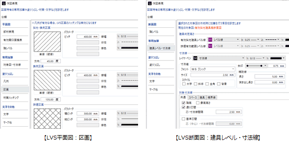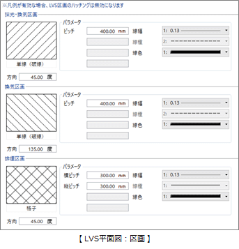 - 作図表現(凡例)の「凡例を使用する」がONの場合、LVS区画のハッチング設定は無効になります。