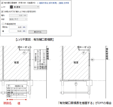 「LVS設定」で設定した有効開口面積表の離れと向きを参照する場合は『法規LVSタブの「離れ」と「向き」の設定を使う』をONにします。有効開口面積表の丸めはモデル側の設定を参照します。- 「列幅自動設定」がONのときは、表の文字が収まるように各項目の列幅が自動設定されます。